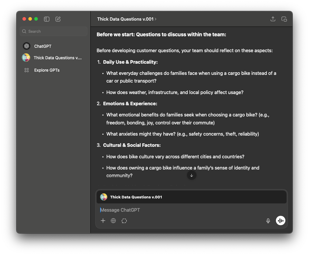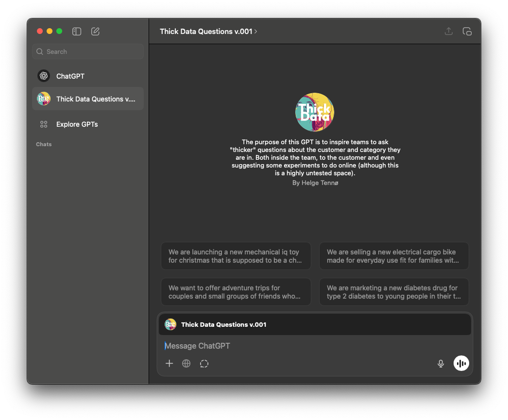 The purpose of this GPT is to inspire teams to ask "thicker" questions about the customer and category they are in.